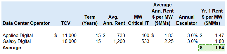 Colocation ($/MW, Tenant Fit-Out): $1.65MM/MW approximates the average starting base rent for CoreWeave’s leases with Applied Digital and Galaxy: