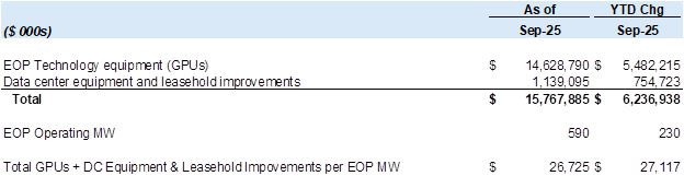 GPU CapEx per MW: $27MM is in-line with Sep. 2025 balance sheet & MW disclosures.