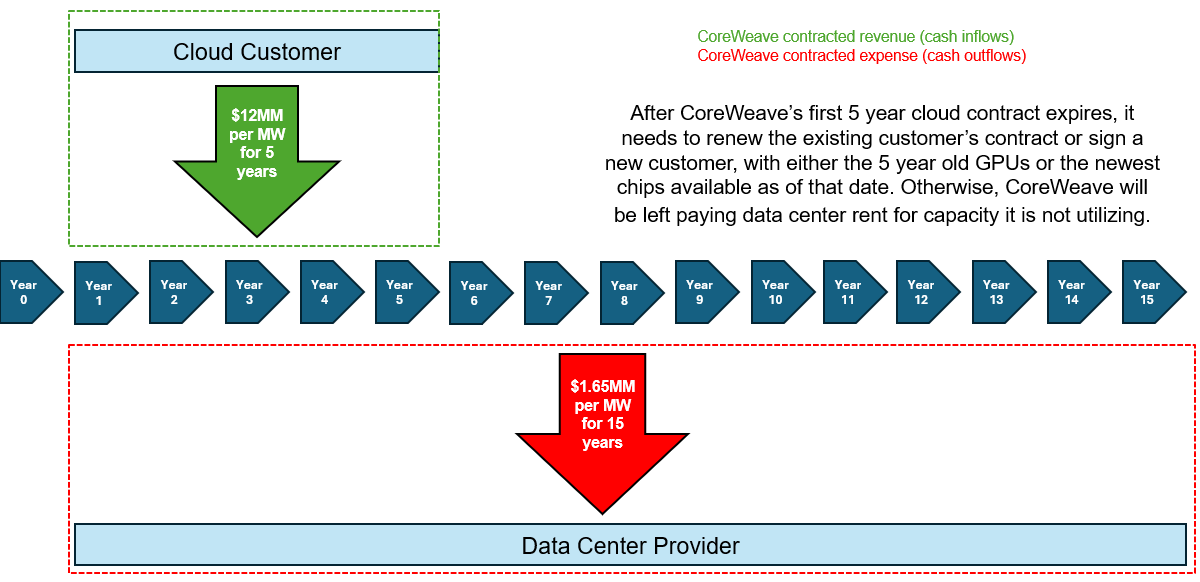 Asset / Liability Mismatch (Renewal Risk): CoreWeave’s customer contracts typically include 5-7 year terms, while its data center leases run for 10-15 years. Thus in 5 to 7 years, CoreWeave will need to renew expiring cloud contracts and / or sign-up new customers or otherwise be left holding the bag (an obligation to rent a data center capacity it isn’t using). Given the nascency and dynamism of the AI cloud business, it remains to be seen how the renewal cycle plays out. That said, early signs are promising, with CoreWeave stating that customers are re-leasing capacity from old chips at rates close to those of the original contract. Furthermore, assuming CoreWeave’s relationship with Nvidia is still strong in 5 years, CoreWeave should still receive priority allocations of Nvidia’s newest chips at that time.