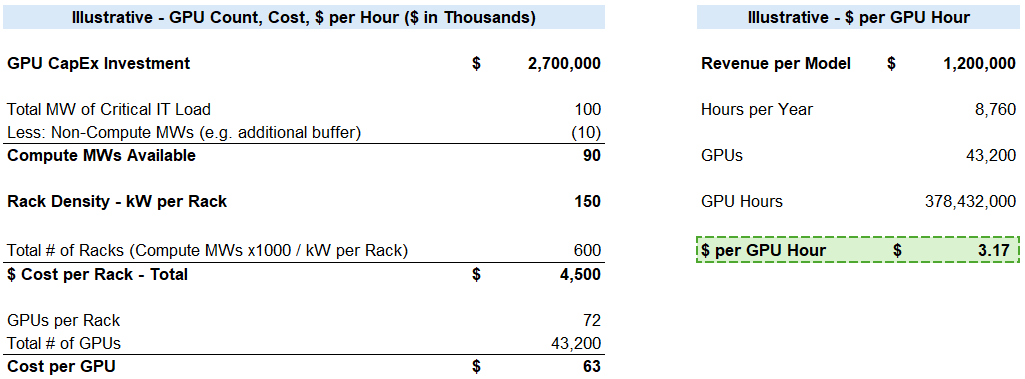 To further stress test the concluded $12MM/MW in revenue, if we assume 150kW rack density and 10 in non-compute MWs, we can deduce that $2.7B in GPU-related CapEx buys 600 racks and 43,200 GPUs (given each rack = 72 GPUs). At $1.2B rev. and 100MW (e.g. $12MM/MW), the implied $ per GPU Hour is $3.17, which is reasonable relative to competitors’ public pricing on Grace Blackwell rentals.