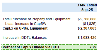 From CoreWeave’s Sep. 2025 10-Q, we can estimate 73% of their CapEx was funded via DDTL draw: