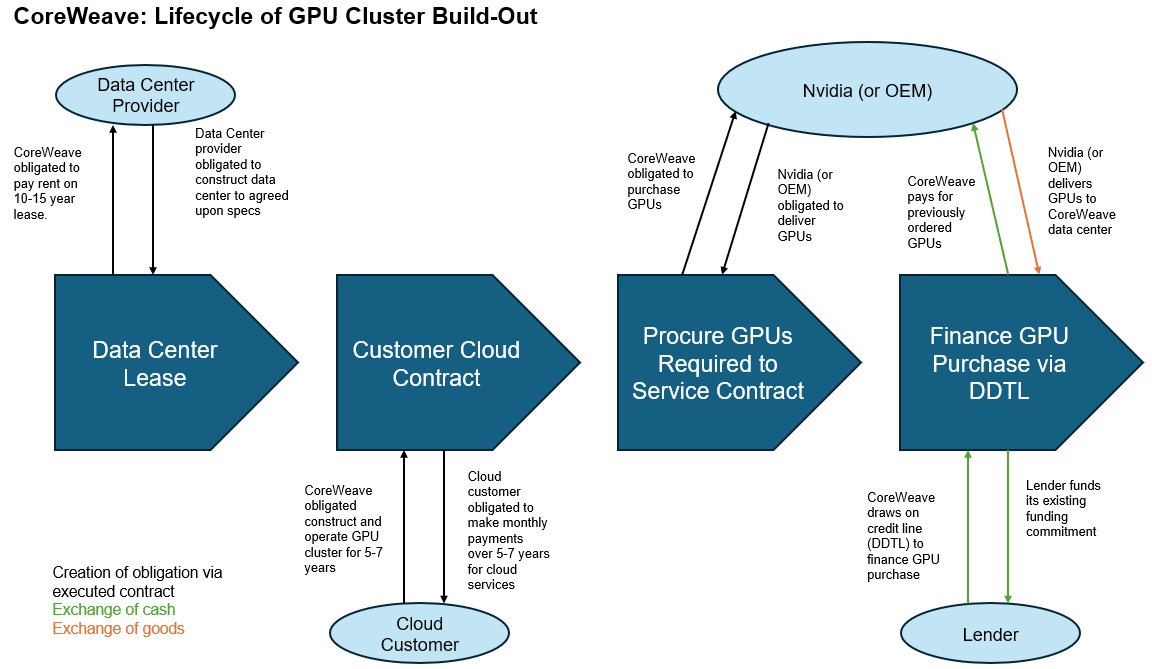 CoreWeave is responsible for purchasing the GPUs (Note: As detailed below, CoreWeave does not procure GPUs until after signing its own cloud customer contract).