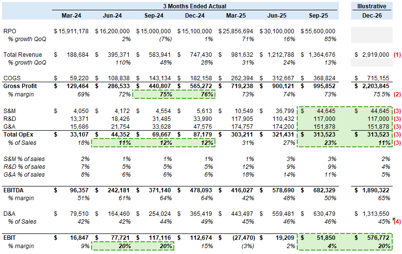 For the quarter ended September 2025, CoreWeave’s reported EBIT margin was 4%, as S&M, R&D, and G&A (“OpEx”) collectively represented 23% of revenue. With contract-level EBIT margins in the ~35% ballpark, there is a clear path for CoreWeave to print 20%+ reported EBIT margins via the realization of operating leverage. For illustrative purposes, we can use the assumptions outlined below to forecast Q4 2026E financials to easily conceptualize the potential for margin expansion: