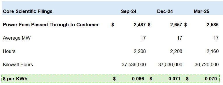 Electricity: Per Core Scientific (CORZ)’s 10-Qs, CoreWeave is paying $0.066 to $0.071 per KWh. Note only Sep. 2024 – March 2025 are shown below as these are the only quarters whereby CORZ disclosed the total MW energized for its lease with CoreWeave: