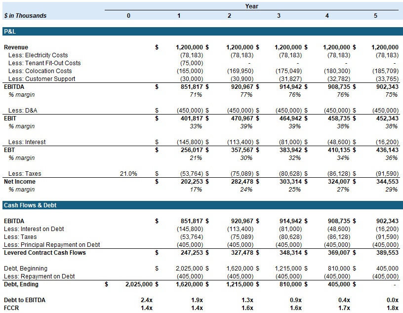 · Contract-level leverage declines from 2.4x at the onset to zero by Year 5 as the debt is fully amortizing. Even at Year 1, leverage remains modest with fixed charge coverage (EBITDA / Interest + Taxes + Debt repayment) well above 1x.