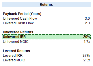 As shown above, the unlevered IRR on the contract is 20%. A few items worth highlighting are noted below, while the Appendix contains additional commentary around the assumptions used.